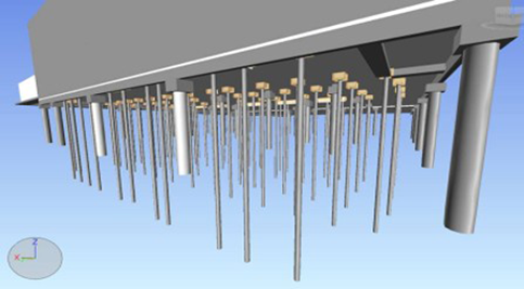67 piles in the clay ground sustain a metallic reinforcement frame for machine room floor.